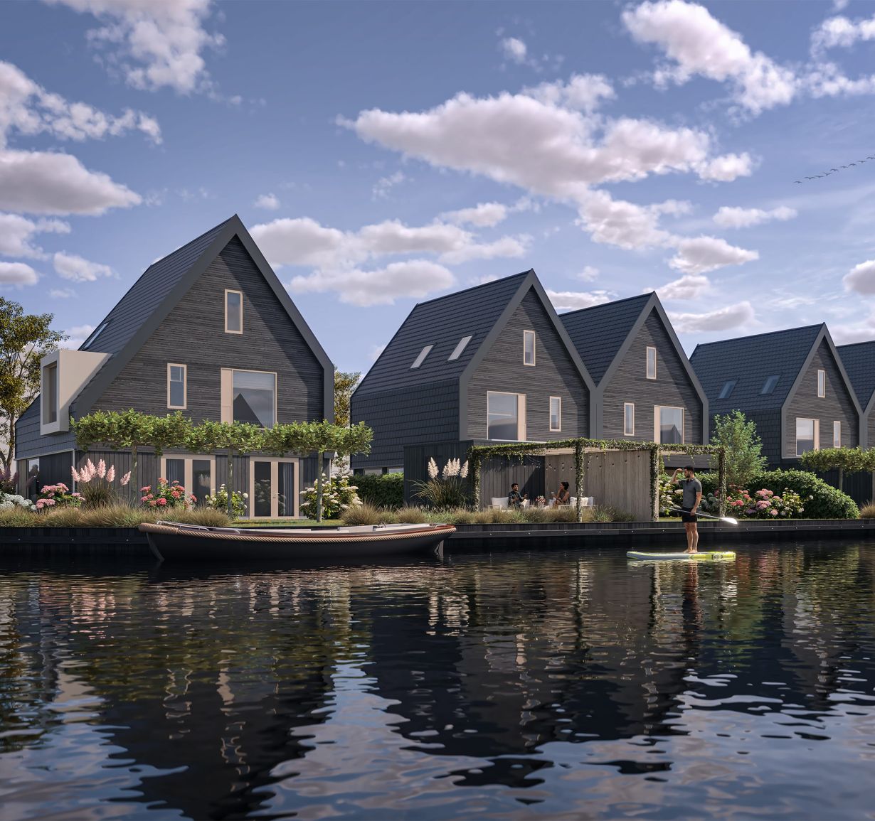 De woningen zijn ruim van opzet, met grote raampartijen die je trakteren op verrassende zichtlijnen richting de landerijen en het water van de Kroonduikervaart. Dankzij de zuidgerichte tuinen geniet je de hele dag van de zon. En als kers op de taart je eigen aanlegplaats. Vanuit je tuin gooi je zo de trossen los voor een dag vol avontuur op het water.